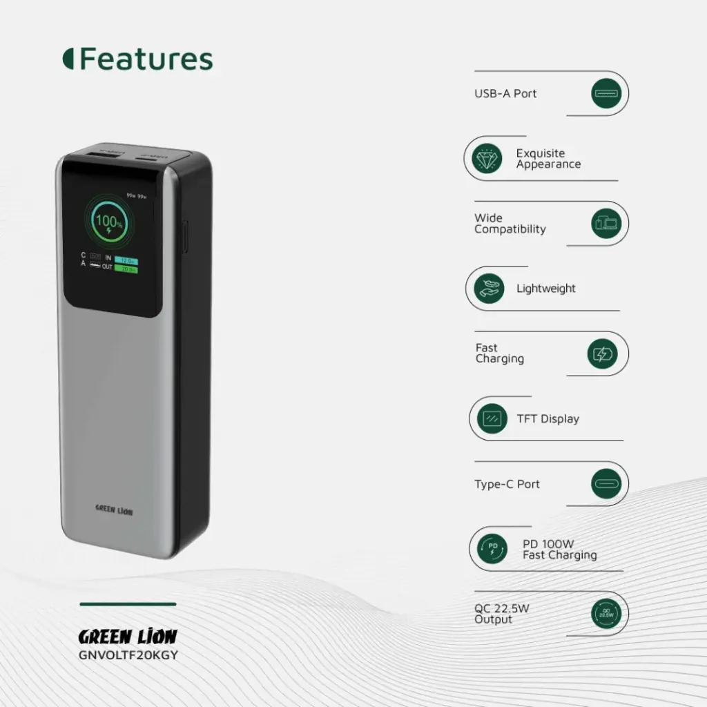پاوربانک 20000 میلی آمپر ولتورا گرین لاین Green lion Voltura 20000mAh بسیار جمع و جور است و دارای قدرت بالا می باشد که شارژ سریع را به شما ارائه میدهد.